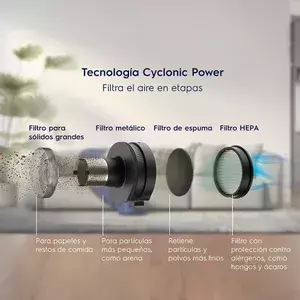 Gracias a su avanzada tecnología ciclónica, esta aspiradora filtra el aire en varias etapas, reteniendo polvo y micropartículas, y devolviendo aire más puro a tu ambiente. Además, prolonga la vida útil de los filtros, manteniendo la eficiencia durante más tiempo.